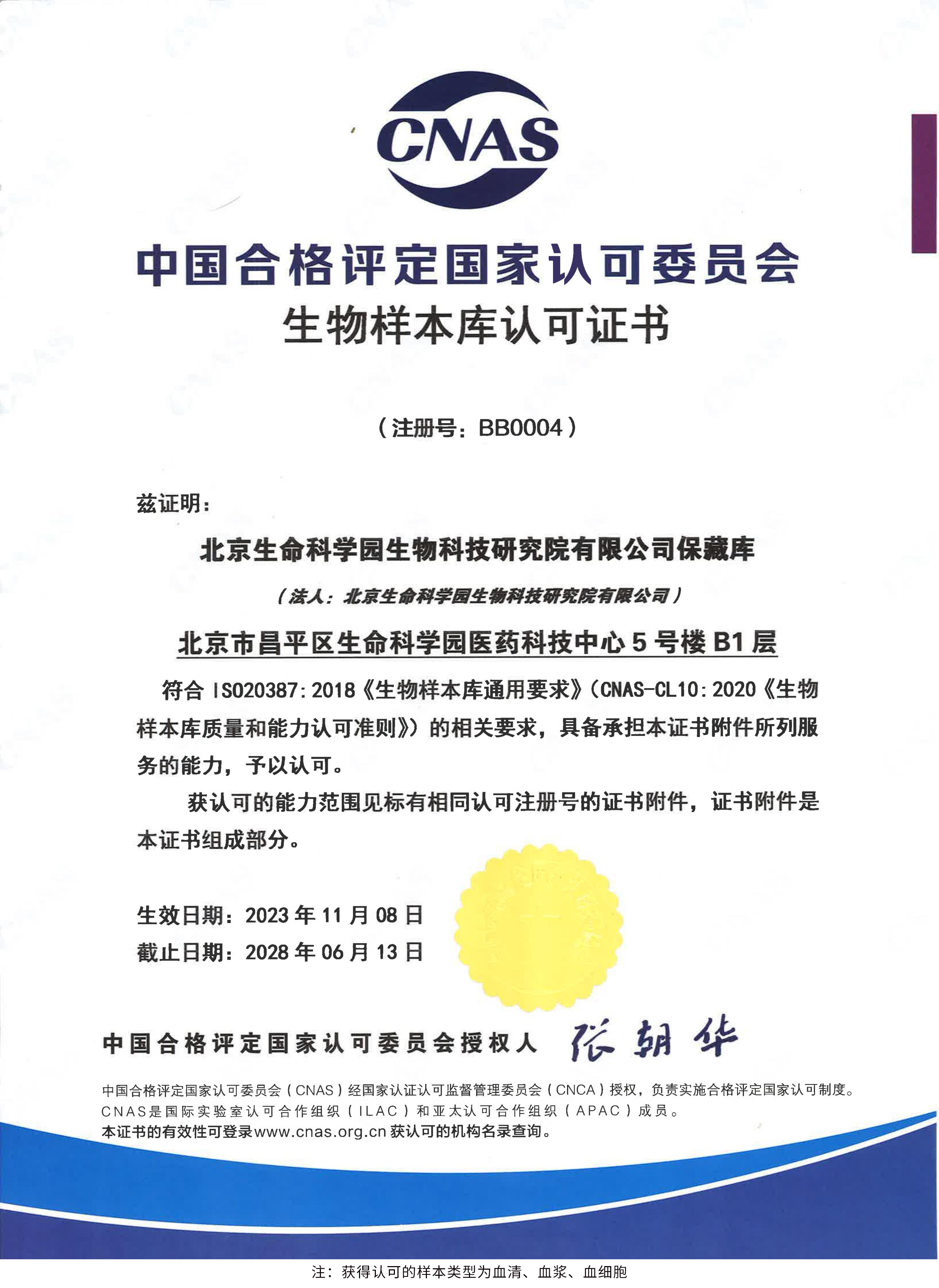 北京生命科學(xué)園生物科技研究院(以下簡(jiǎn)稱“北京生物樣本資源庫(kù)”)(Biobank of Life Science Park,簡(jiǎn)寫“BoLSP”)是一家由北京市科委和中關(guān)村生命科學(xué)園共同支持設(shè)立的第三方生物樣本庫(kù)公共服務(wù)平臺(tái),秉承北京重大疾病臨床數(shù)據(jù)和樣本資源庫(kù)(以下簡(jiǎn)稱“北京庫(kù)”)(Beijing Biobank of Clinical Resources,BBCR)十余年的發(fā)展成果,聚合眾多臨床樣本專家的專業(yè)共識(shí),致力于在生命科學(xué)、生物醫(yī)藥研究領(lǐng)域發(fā)揮銜接樣本資源持有者與研究者的橋梁作用,解決生物樣本資源開(kāi)發(fā)上下游信息不對(duì)稱、資源共享困難等問(wèn)題。研究院在北京中關(guān)村生命科學(xué)園昌平園區(qū)建立了2000㎡生物樣本庫(kù),最大存儲(chǔ)規(guī)模達(dá)1000萬(wàn)份。研究院遵循CNAS-CL10:2020《生物樣本庫(kù)質(zhì)量和能力認(rèn)可準(zhǔn)則》,同時(shí)結(jié)合北京庫(kù)過(guò)去十年的工作經(jīng)驗(yàn)與教訓(xùn),建立了一套完善的生物樣本保藏質(zhì)量管理體系,從人、機(jī)、料、法、環(huán)、控多個(gè)角度,實(shí)現(xiàn)生物樣本保藏過(guò)程的全面質(zhì)量控制,先后獲得國(guó)家科技部頒發(fā)的人類遺傳資源保藏行政許可證書(shū)和中國(guó)合格評(píng)定國(guó)家認(rèn)可委員會(huì)(China National Accreditation Service for Conformity Assessment,CNAS)頒發(fā)的“CNAS認(rèn)可證書(shū)”。